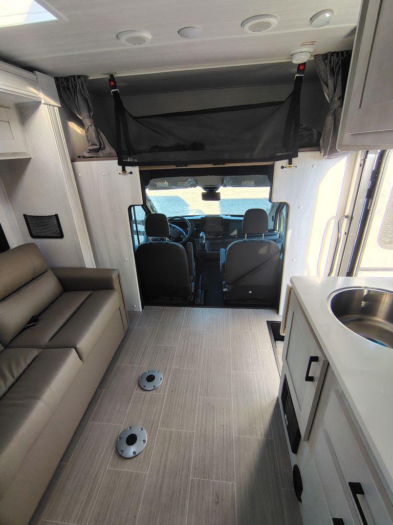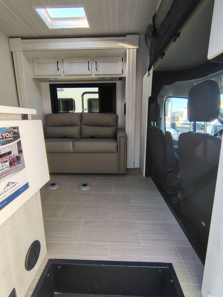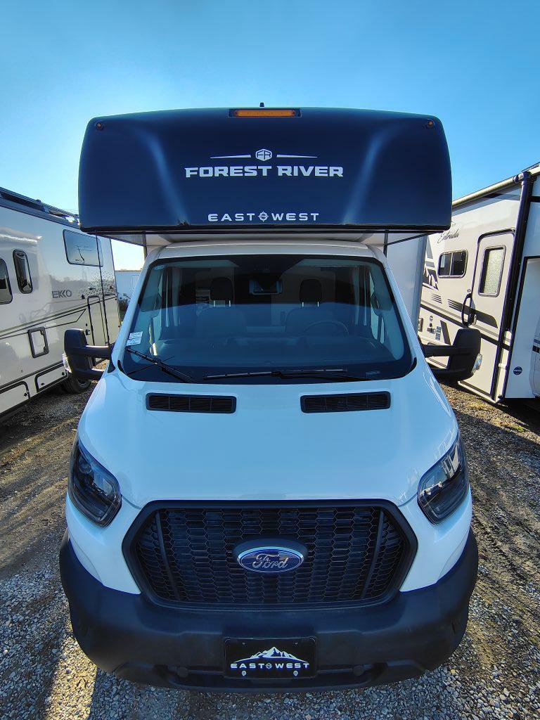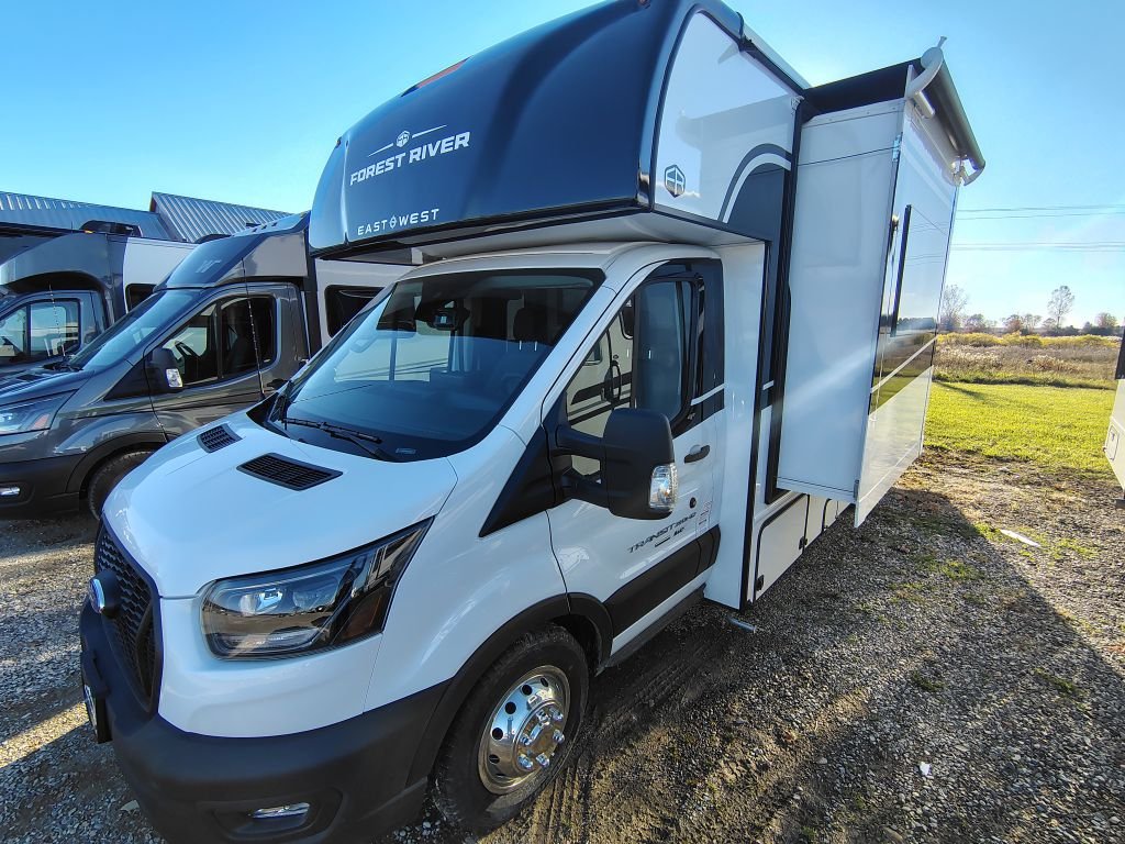 The 2026 East To West Alita 23TK is a Class C motorhome built on the Ford AWD 350 Transit chassis. It is a compact RV, measuring approximately 26 feet long, and is designed for couples or small families. A single slide-out and a cab-over bunk expand the interior living and sleeping space.