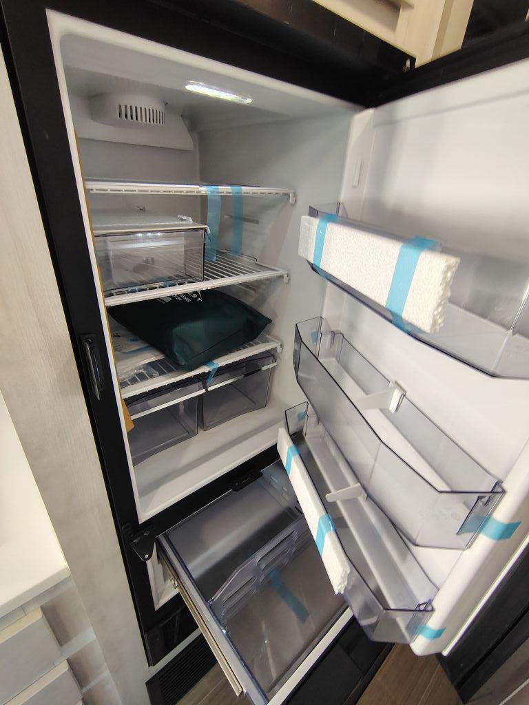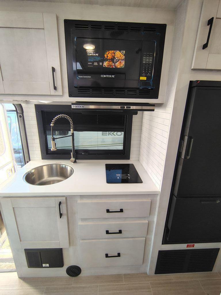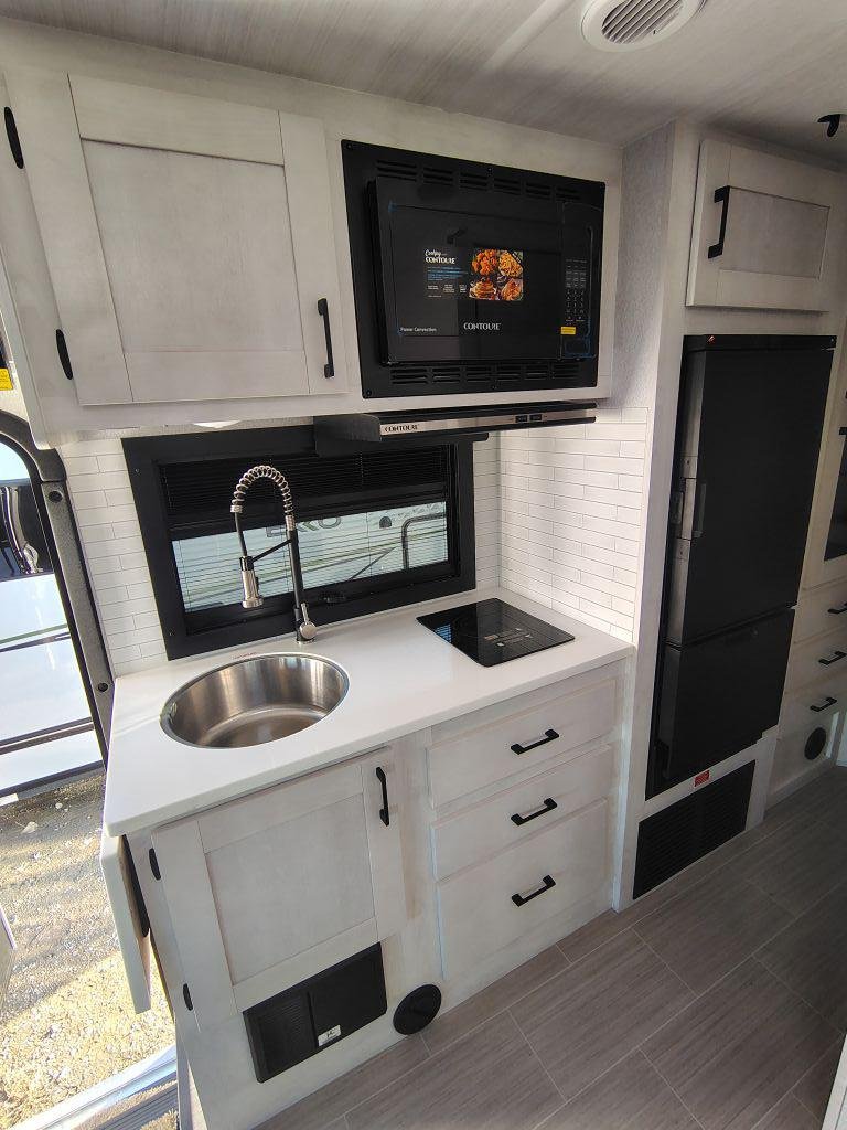 - Kitchen: Includes a 12-volt, 6-cubic-foot refrigerator, an induction cooktop, and a convection microwave. The solid-surface countertop features an extension for extra prep space.