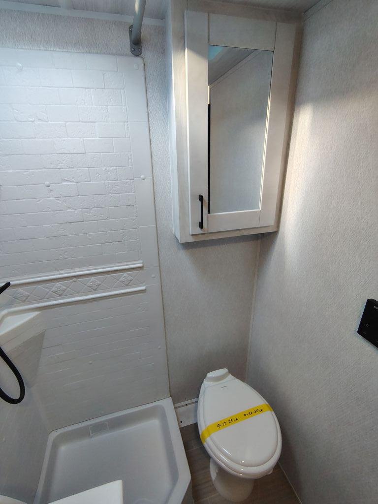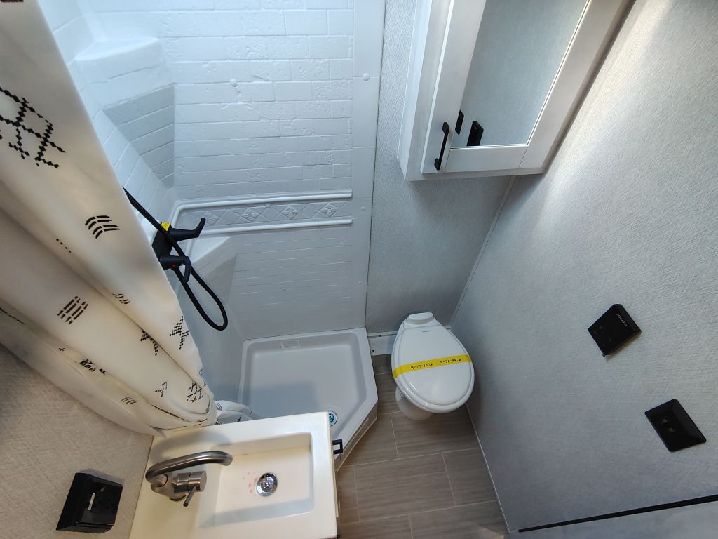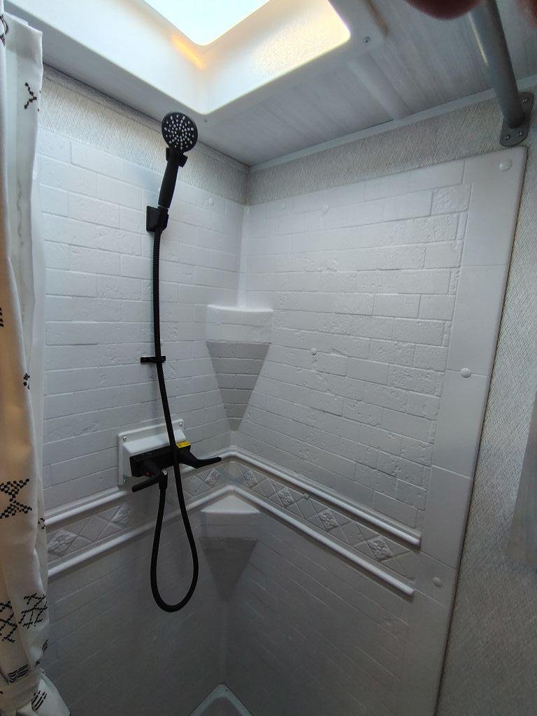 - Bathroom: A dry bath with an angled shower and a medicine cabinet. The doors open out to create a more spacious changing area.