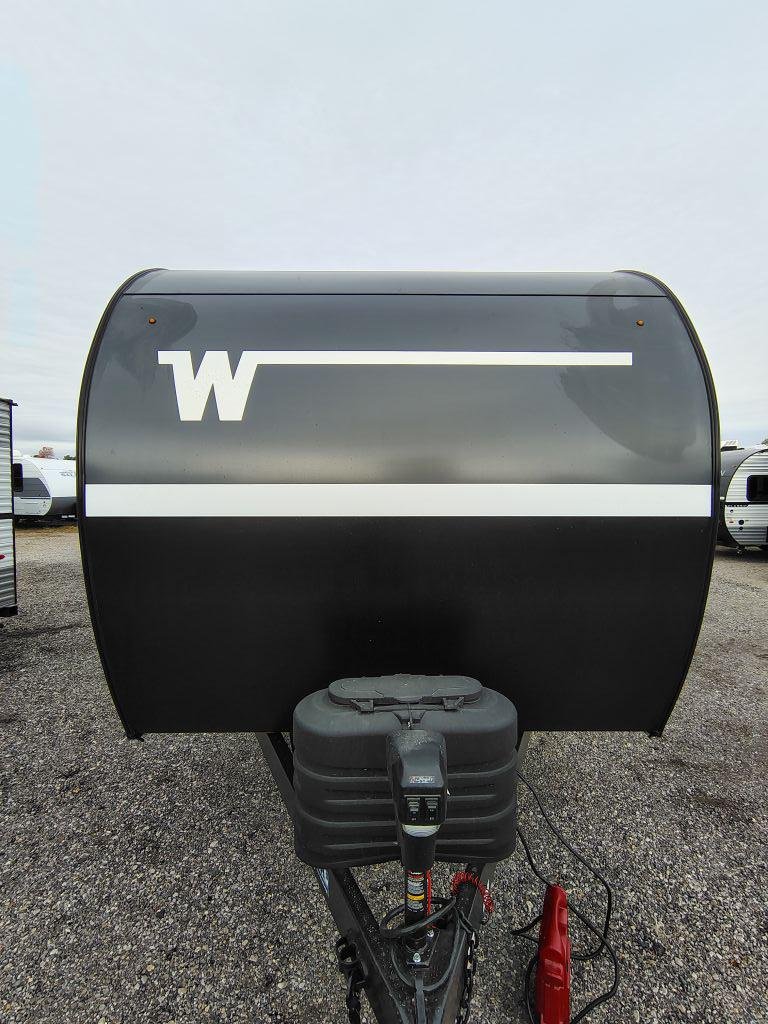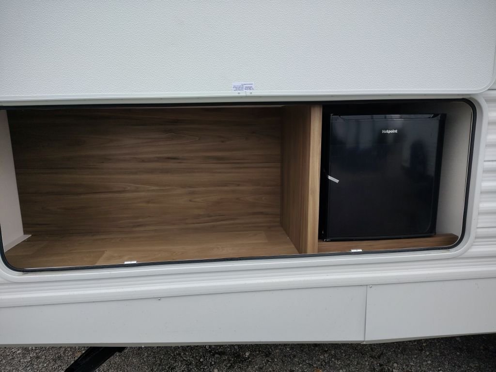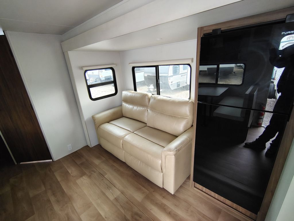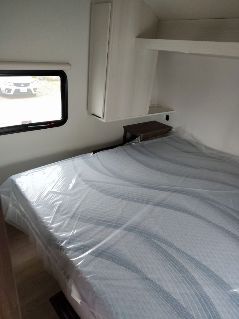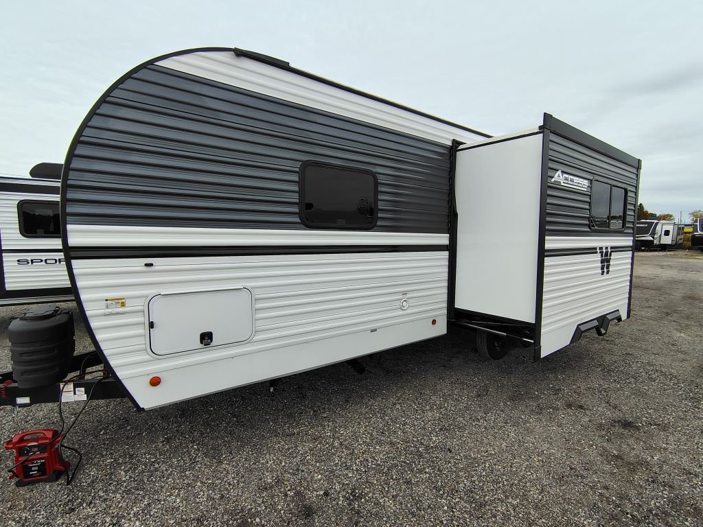 The exterior has one slide, a mini fridge with a large compartment, a power awning, and a power tongue jack, backup camera prepped, and 2″ receiver hitch.