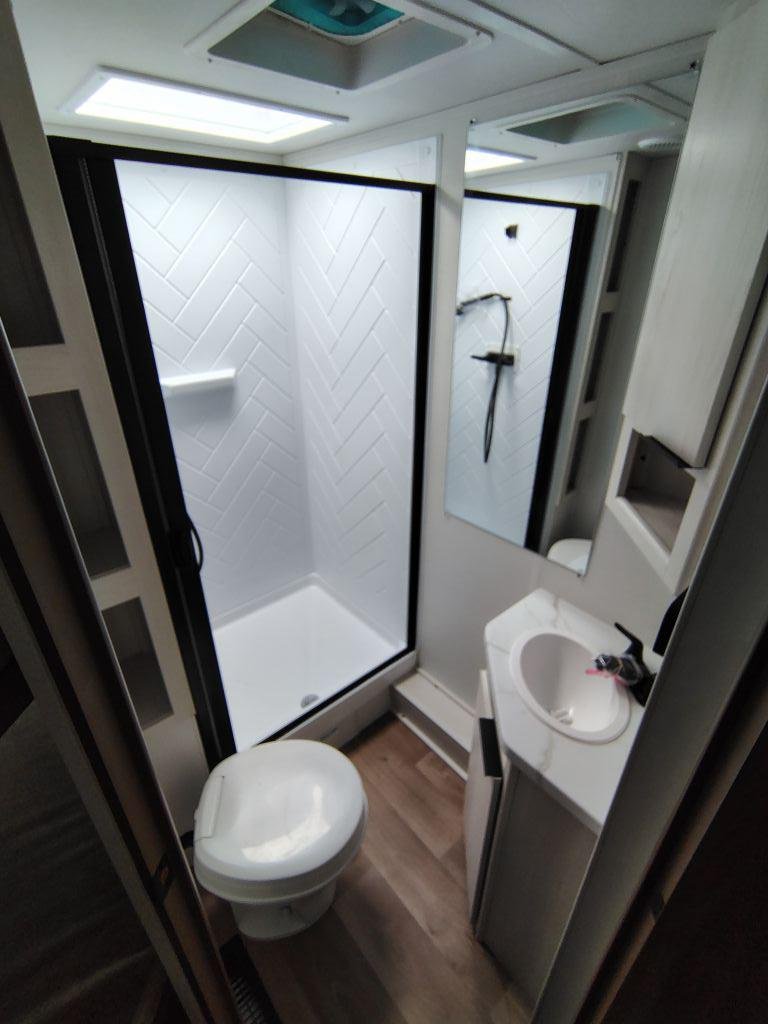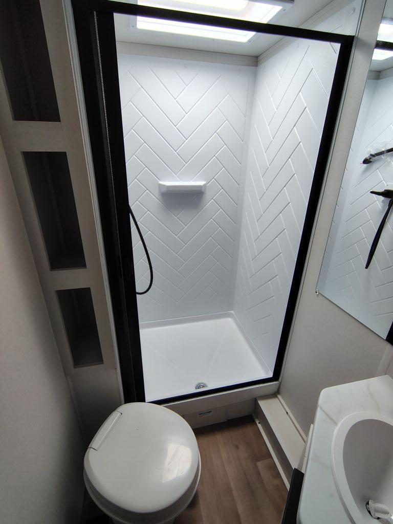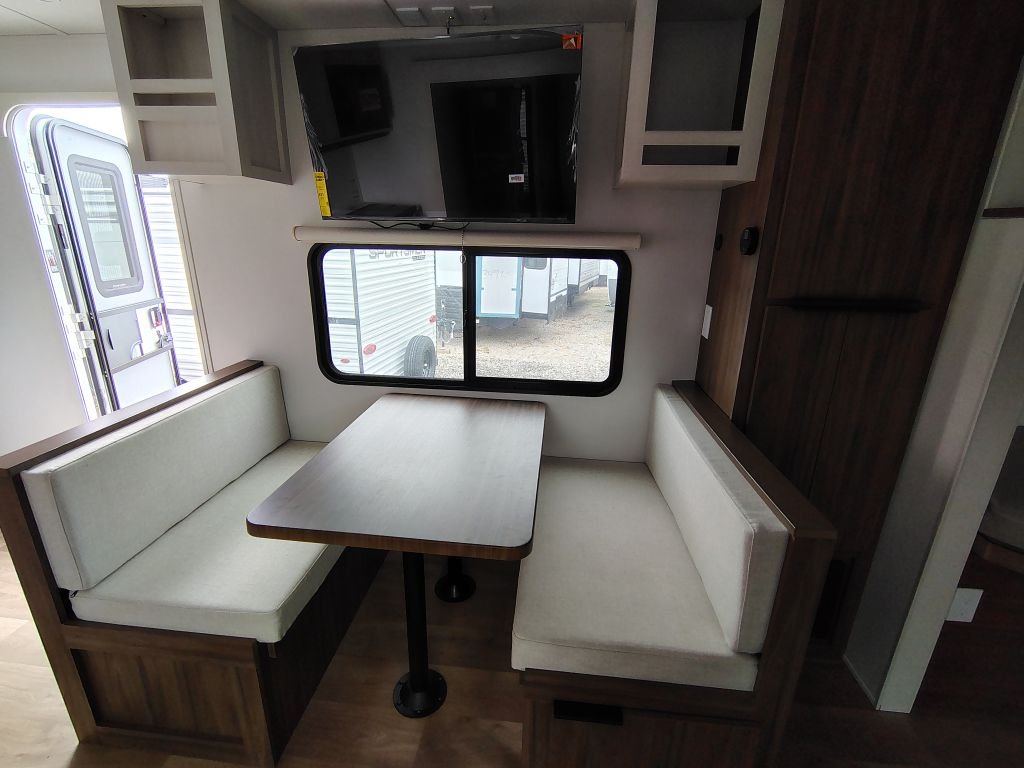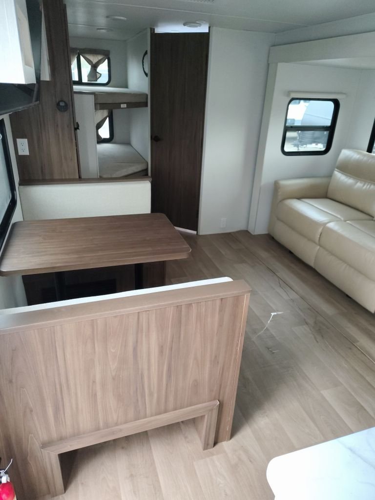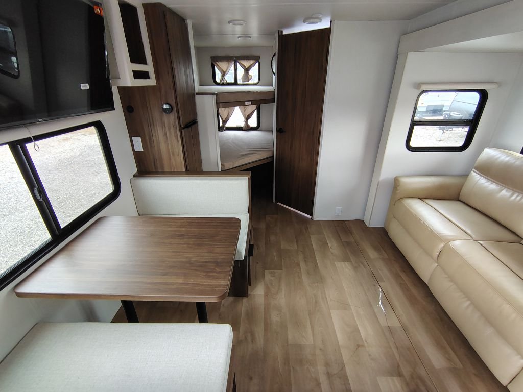 The interior has clean, contemporary styling with a booth-style dinette, sofa (that folds out into a bed), and smart TV. The kitchen is equipped with a 3-burner cooktop, microwave, and full-size refrigerator. The rear features two full-size bunks and a spacious bathroom with a walk-in shower, skylight, and vanity. The primary bedroom is in the front with a walk-around bed, and wardrobe closets.