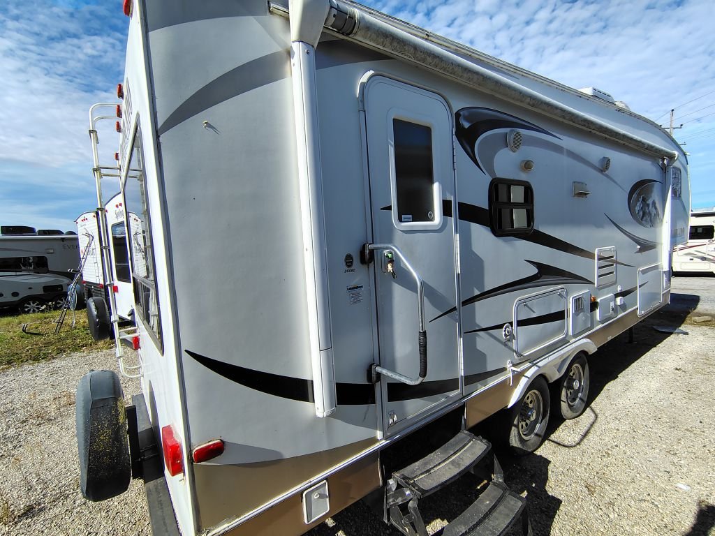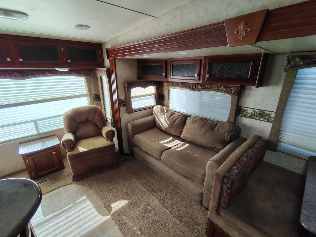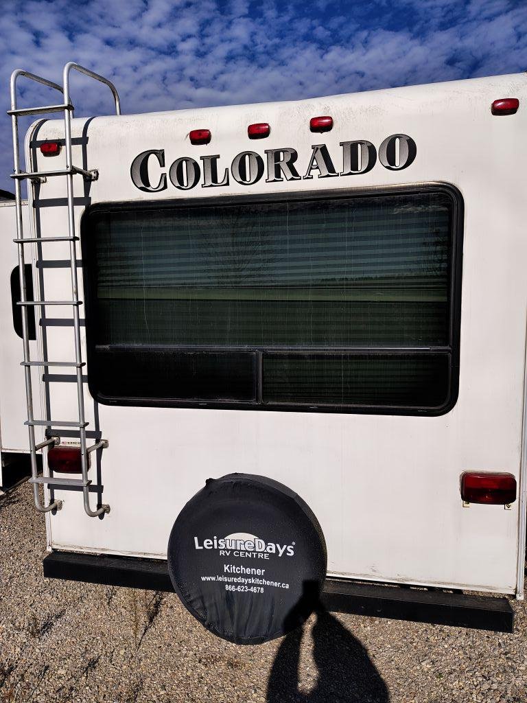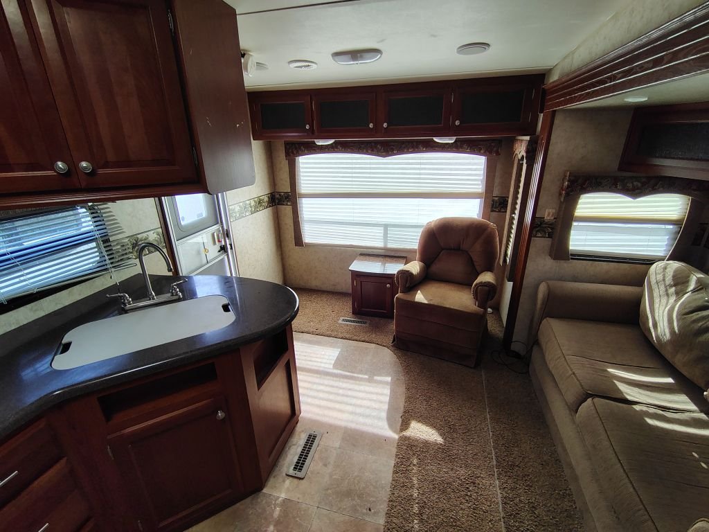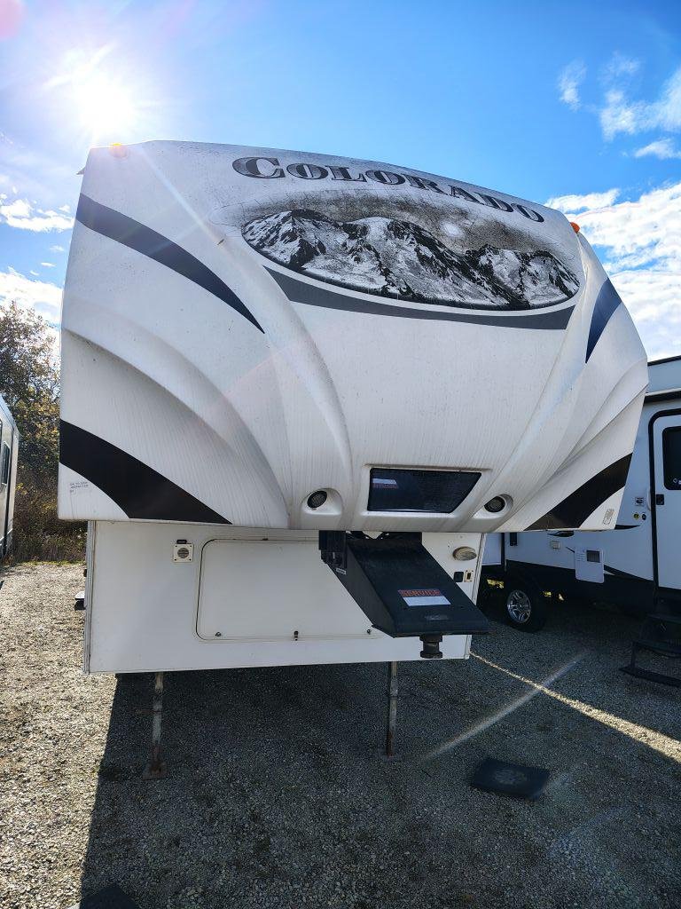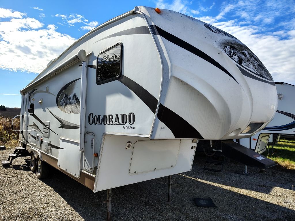 The 2011 Dutchmen Colorado 260RL is a fifth-wheel with a length of 30' 5", a single slide-out, and a sleeping capacity of up to 6 people. Its dry weight is approximately 7,488 lbs, with a carrying capacity of 3,072 lbs and a hitch weight of 1,442 lbs. Key features include a 13,500 BTU air conditioner, 30,000 BTU heater, 52-gallon freshwater tank, and a standard patio awning.