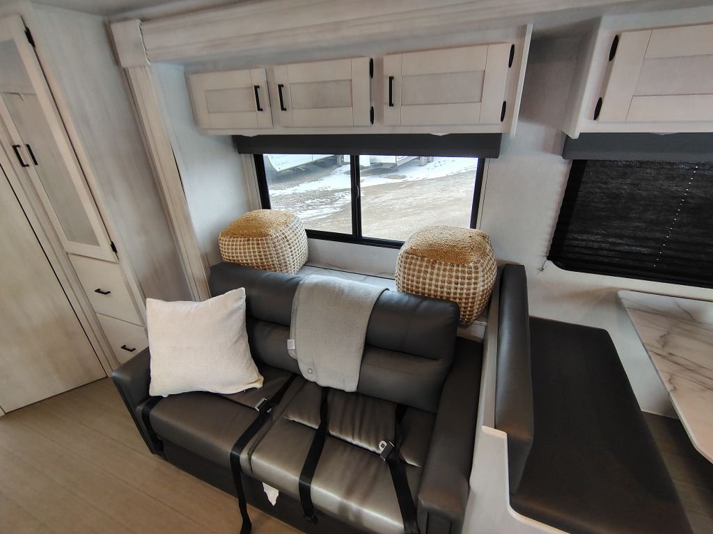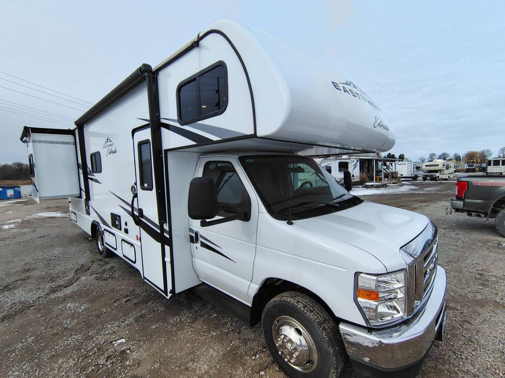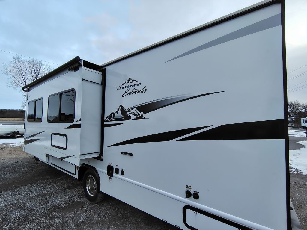 Entrada Class C gas motorhome 2600DS highlights - Two Slides - Full Bathroom - Private Bedroom - Sofa - 60" x 80" Bunk Over Cab You can explore and discover so many new destinations with this Entrada Class C gas motorhome! The first thing that you'll notice about this coach is that it has extra interior living space because of the two slides. One of those slides holds the queen-size bed back in the private bedroom, and the bedroom is sectioned off from the rest of the coach with an accordion door. The full bathroom is right next to the bedroom so that you can quickly and effortlessly hop in the shower each morning. Outside of the bathroom, you'll find a linen closet which can hold your towels or toiletries, and the kitchen pantry can hold your snacks. This coach even has anLED TVfor inside entertainment, so you can sit back on the sofa or booth dinette and watch with pleasure. With any Entrada Class C gas motorhome from EAST TO WEST, the construction consists of a completely laminated coach, a one-piece molded fiberglass front cap, 2" thick sidewalls with Azdel composite exterior, a Dicor Diflex ll TPO roof, and integrated entry step. Some of the Entrada value package features include 12V tank heaters to camp during the cooler months, the Winegard Air 360+, plus backup and sideview cameras with monitor for safety on and off the road. The interior offers a 7-foot interior height for a spacious feel, and hardwood shaker style cabinets. Choose an Entrada for its tasteful design, attention to detail & bright interior.