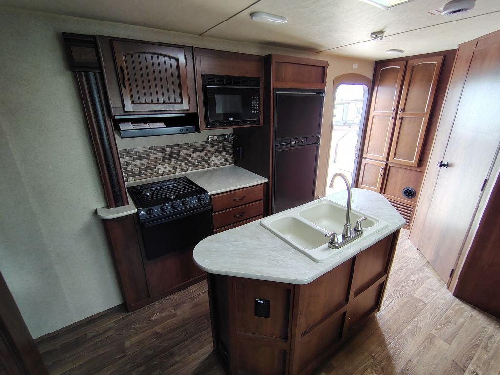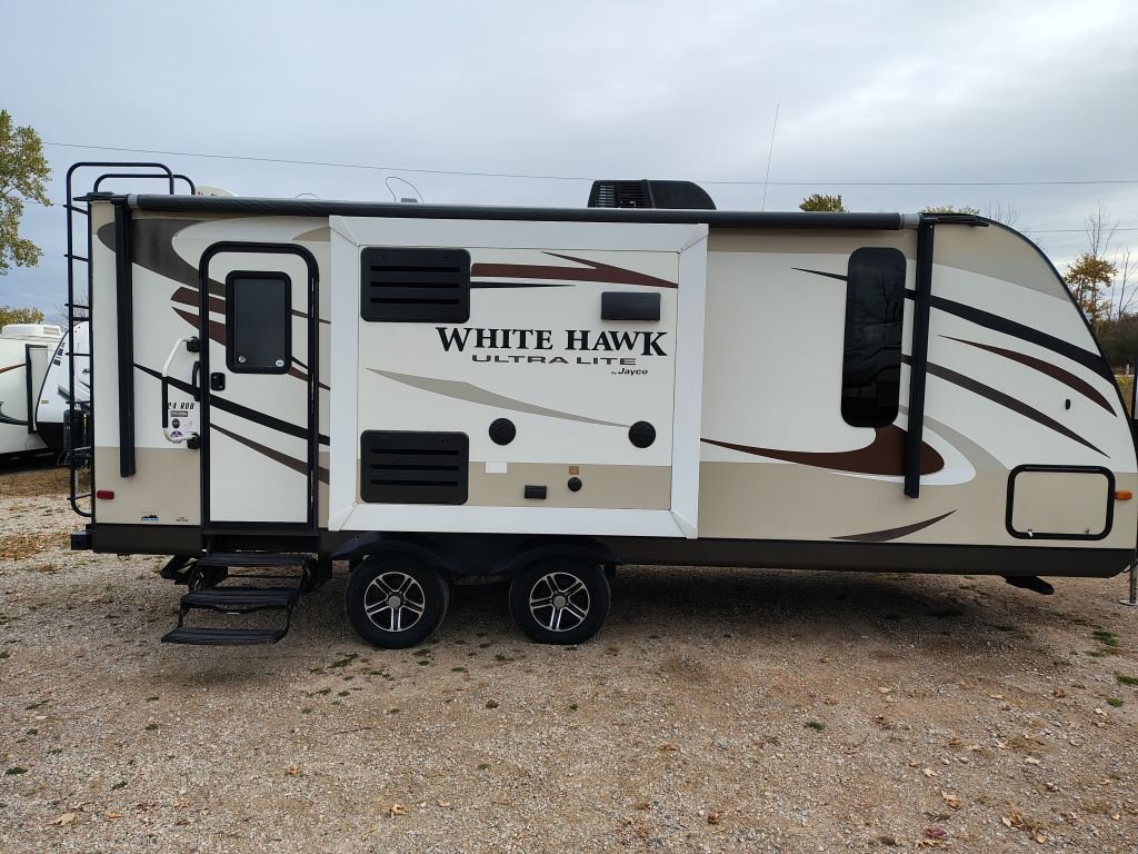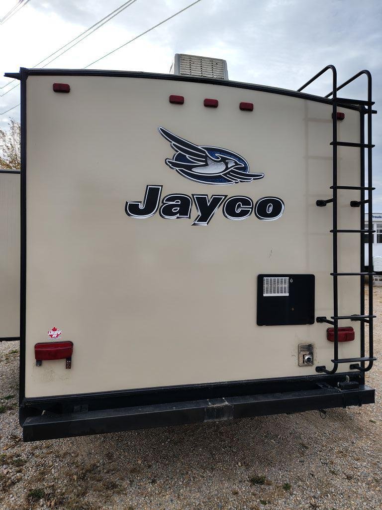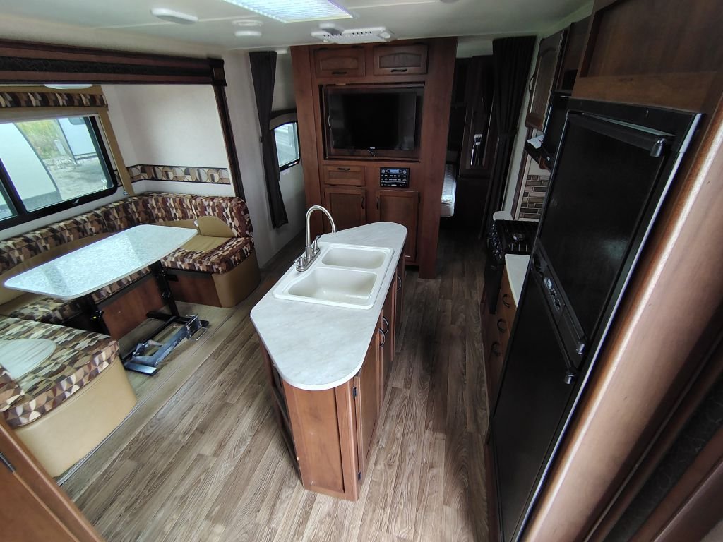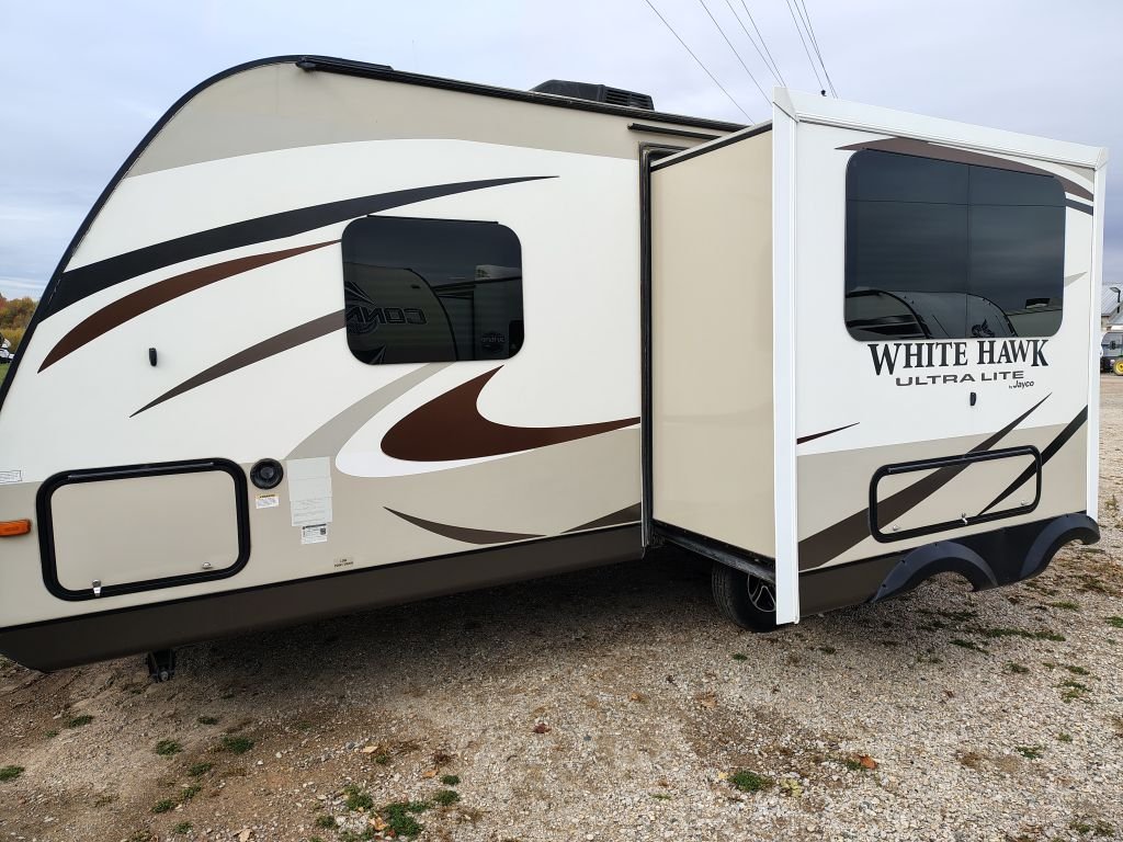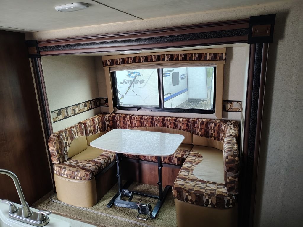 The 2015 Jayco White Hawk 24RDB is a travel trailer known for its lightweight construction, spacious interior, and user-friendly features, making it suitable for couples or small families. It features a rear bath, a U-shaped dinette in a large slide-out, and a front queen bed.