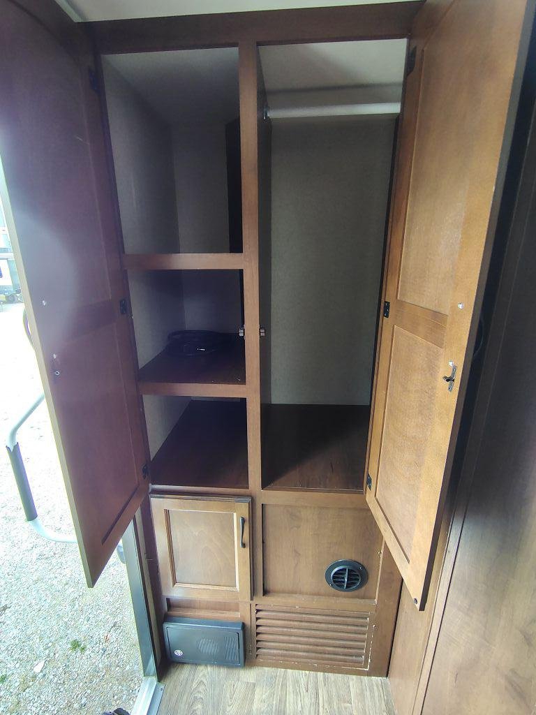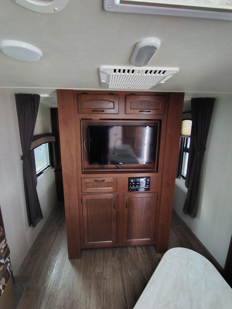 - Features: It comes standard with an electric patio awning with LED lights, exterior speakers, and four stabilizer jacks.