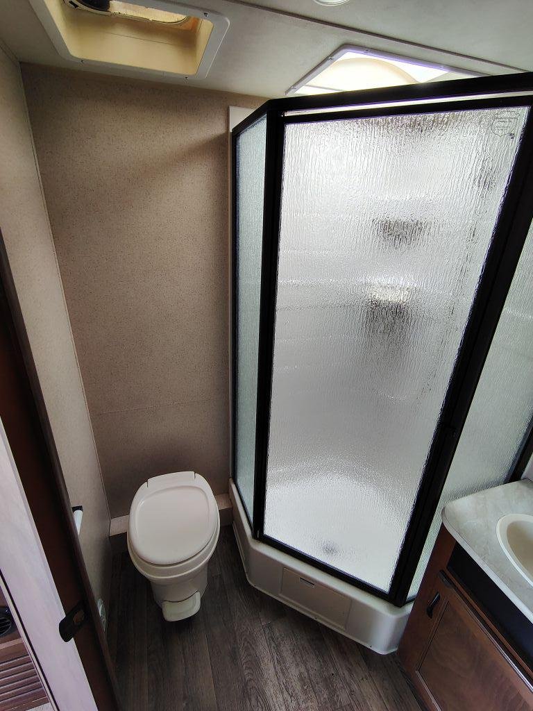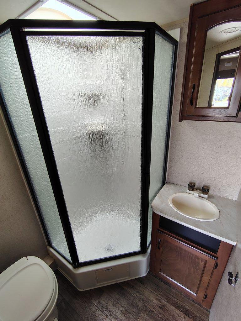 - Bathroom: The rear bathroom features a neo-angle shower with a skylight for extra headroom, a toilet with a foot pedal flush, and a vanity.