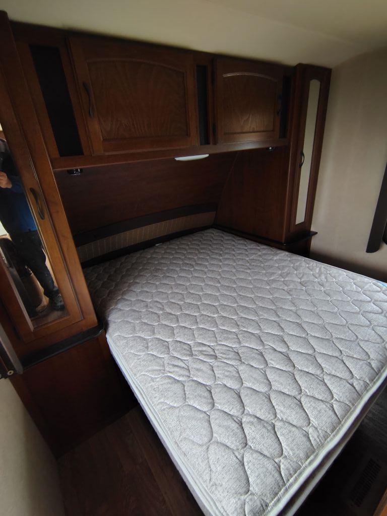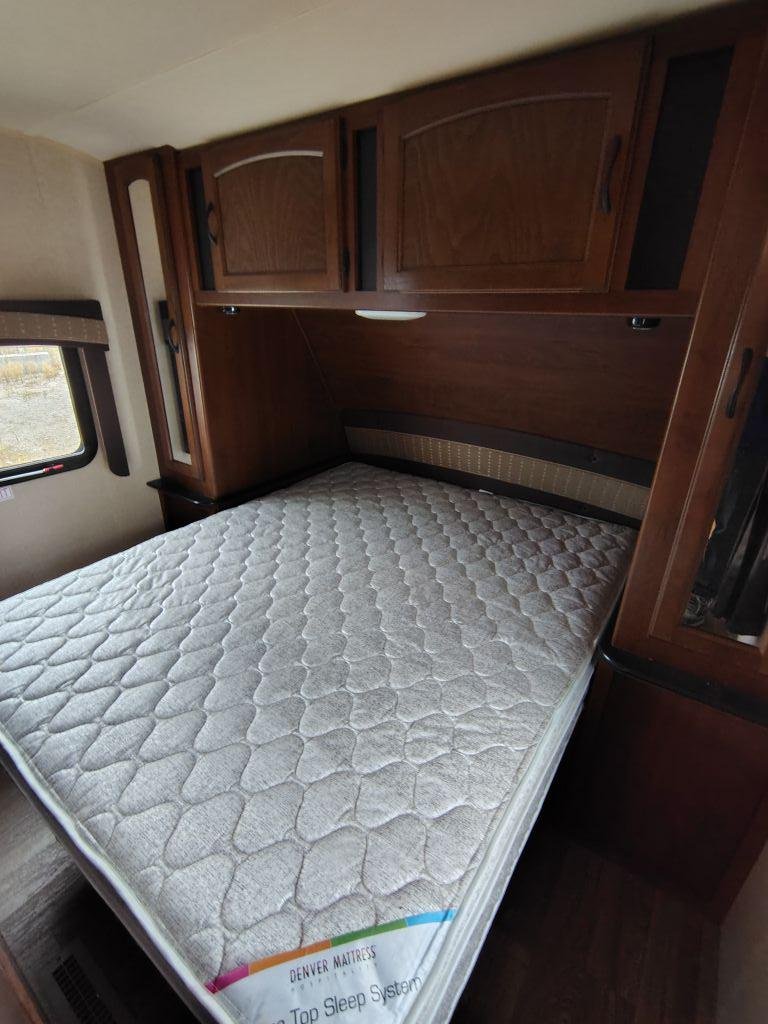 - Bedroom: A front bedroom with a walk-around queen bed and storage on both sides.