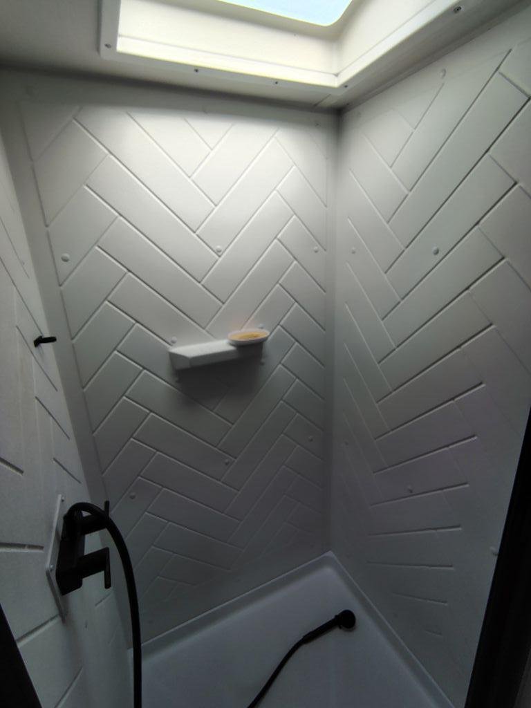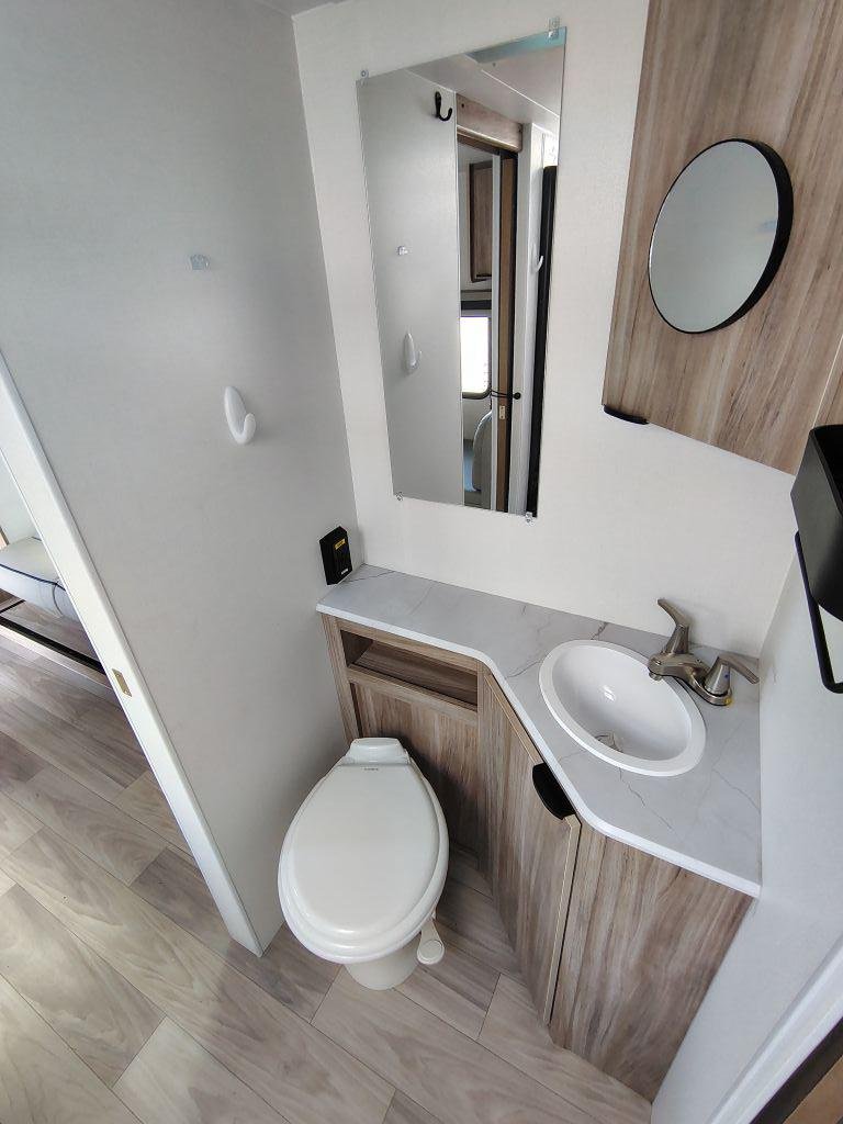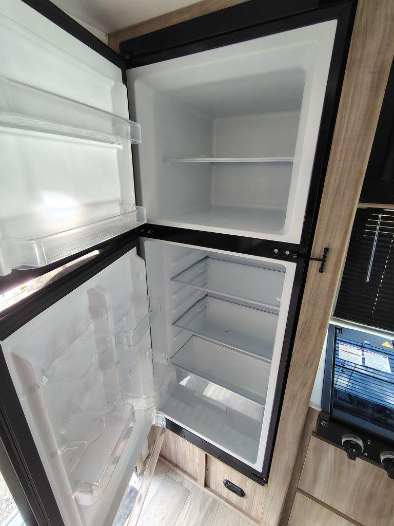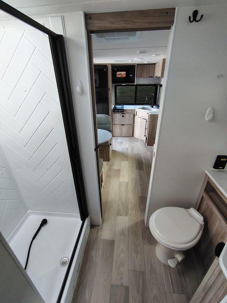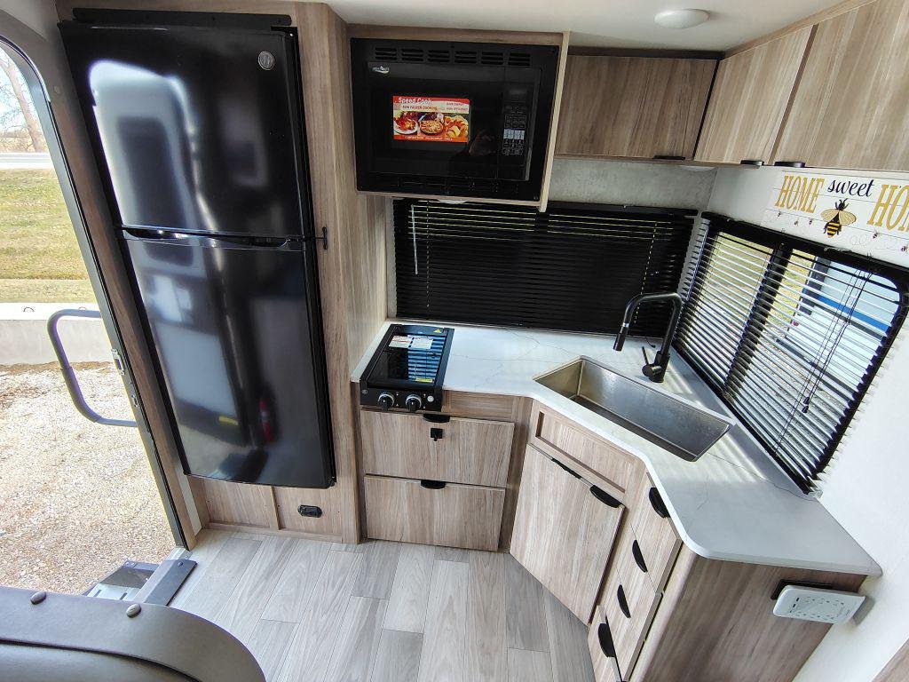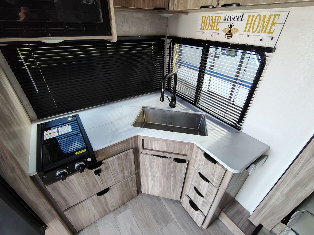 - All-Inclusive Comfort & Convenience: Equipped with essential amenities such as a full galley with a stainless steel sink, 2-burner cooktop, microwave convection oven, and a 10.3 cu. ft. 12-volt refrigerator, plus a dry full bathroom with a large skylight and porcelain toilet.