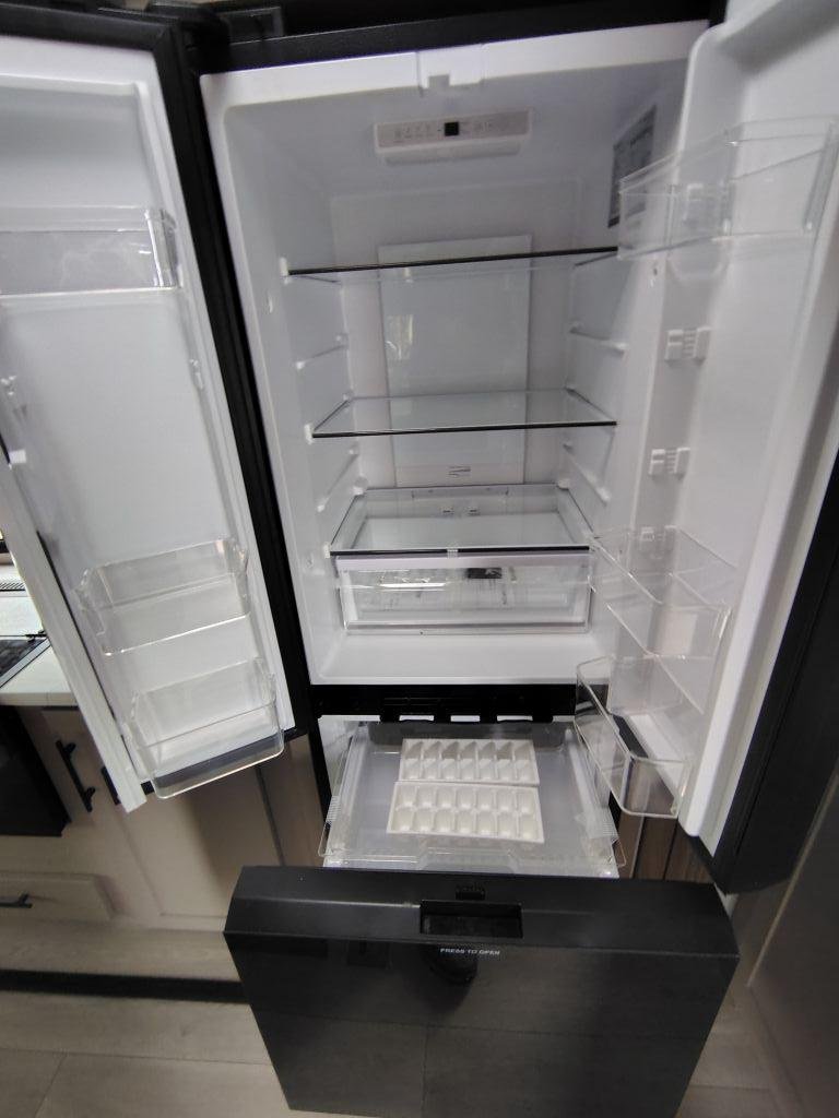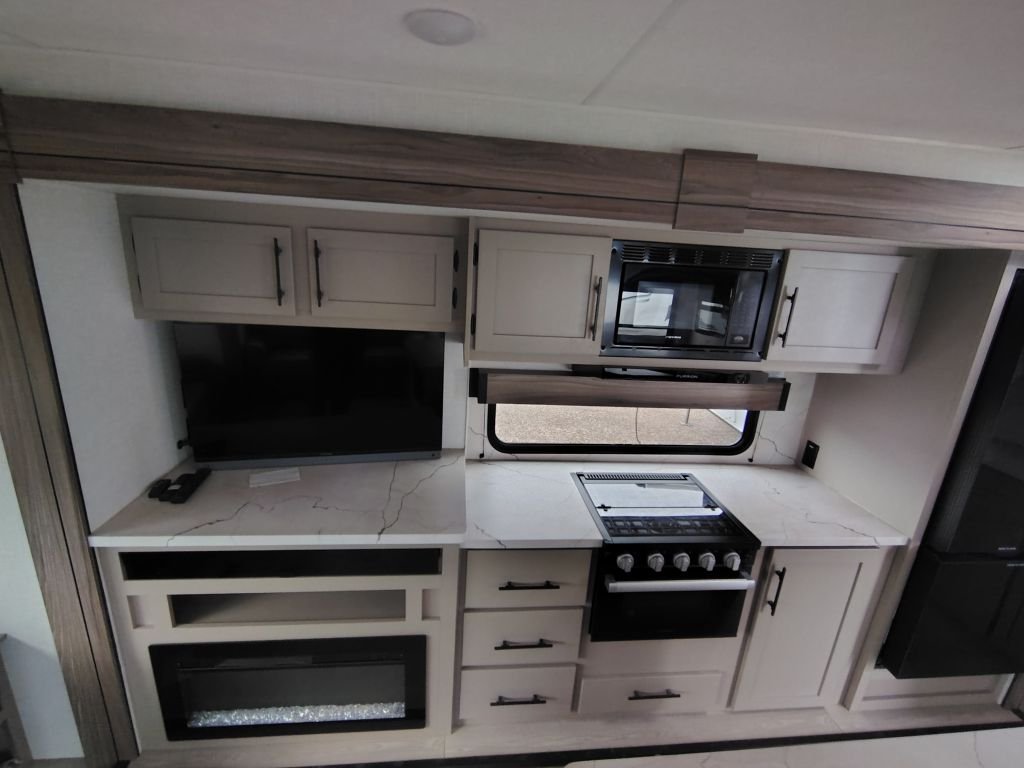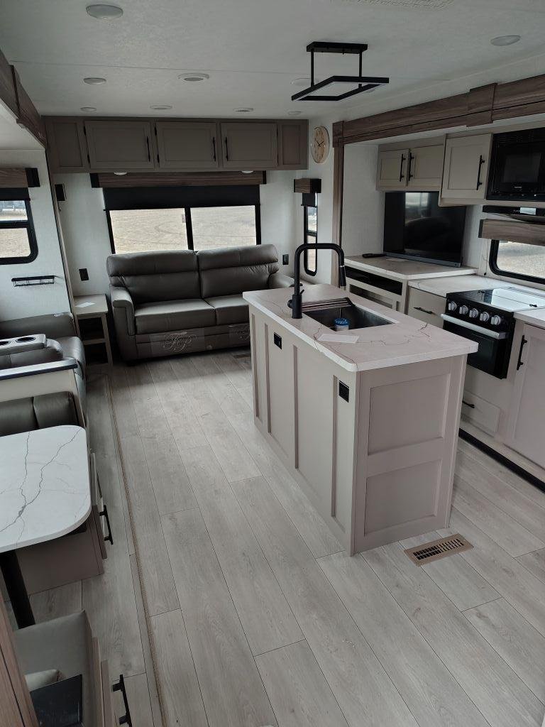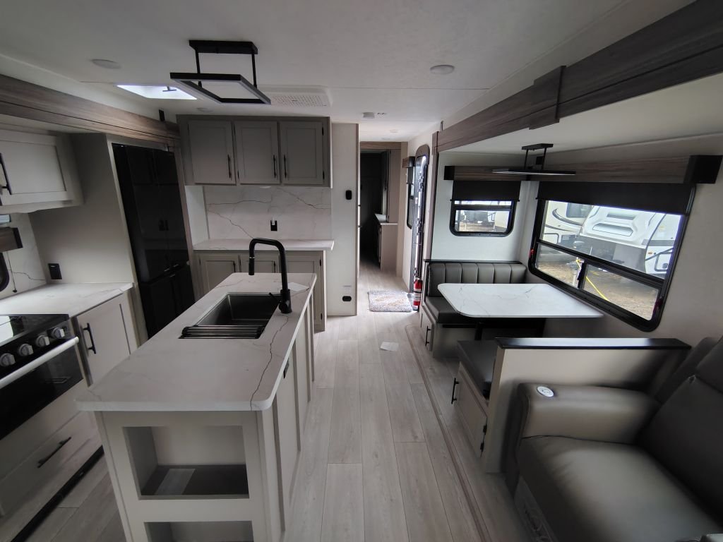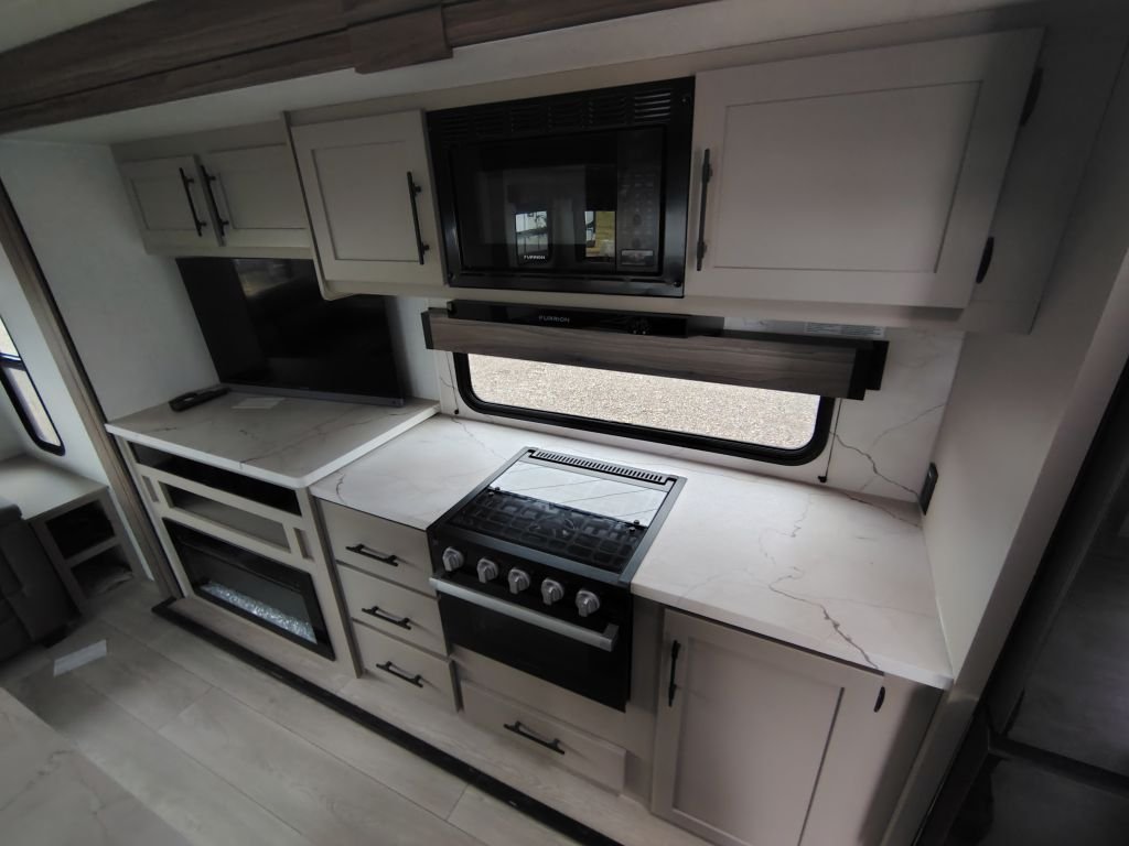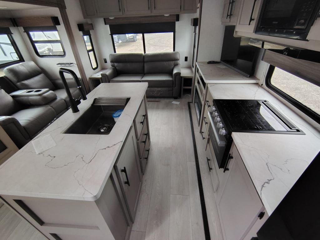 • Kitchen: Kitchen island, large hutch, 3-burner range with oven, and a 12V refrigerator